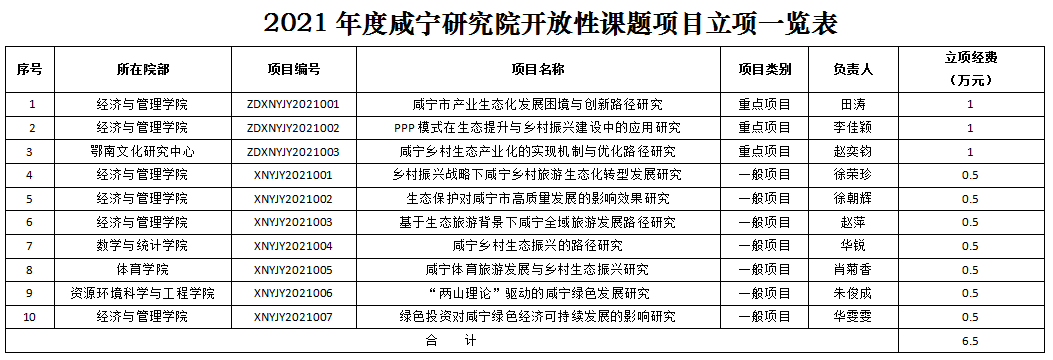 为推动高校新型智库咸宁研究院建设,进一步促进科学研究、学术交流和服务地方工作,根据 2021 年咸宁研究院开放性课题研究项目申报情况,经专家评审,决定对《咸宁市产业生态化发展困境与创新路径研究》等 10 个项目予以立项。